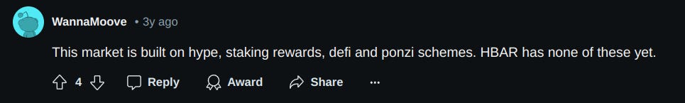 Today Hedera handles more than 2000 TPS real-time. That is more than all the other networks combined on the TPS Dashboard. It’s not like other networks can’t do more than that, but it clearly shows where the DApp developers prefers to go. The value of the native token should come from how useful the network is. I’m not claiming that Hedera is perfect, but to my knowledge it’s the best alternative out there right now.