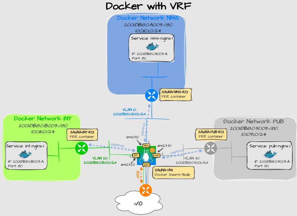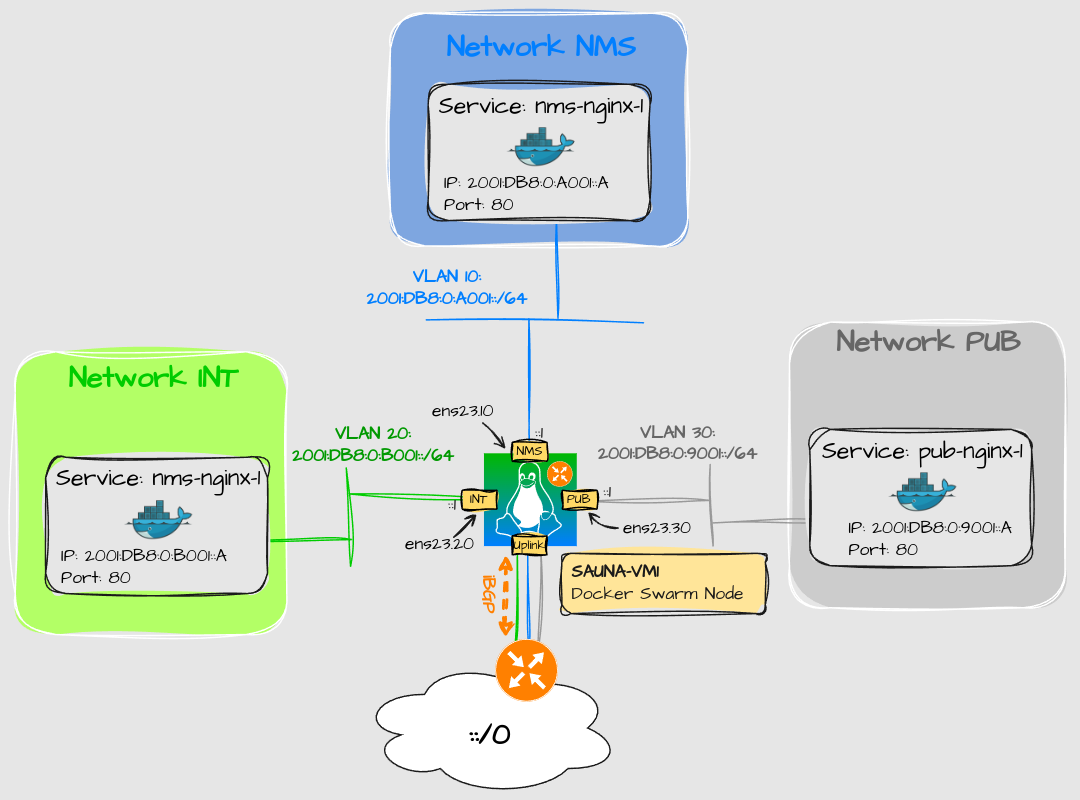 Unfortunately I hit a wall, and I have updated my docker article about reaching containers externally. Docker have included a new bridge option to turn off automatic default GW creation on bridge interfaces but for IPv4 only. Even if I could turn off GW creation on IPv6, there is still a limitation when creating a network; I can’t decide which containers should have a default gateway, and which shouldn’t. It’s either everyone, or nobody. I still have to use the IPVLAN_L2 Driver on the inside to make it work, as I have demonstrated in Containerized Router with VyOS.