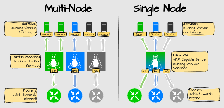 On the right, a more complex solution with a Linux server with VRF support. Each macro segment has it’s own VRF. Only 2 nodes are required for HA.