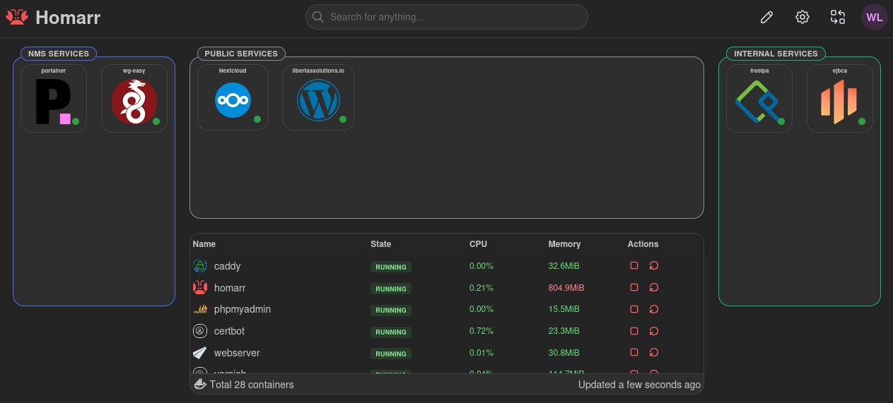 I first saw Homarr in a video by Lawrence Systems and I got inspired. With Homarr you can create one or many different boards with your services on. So in case you forget what the DNS name of your service was, you can easily reach it from one of your boards:
