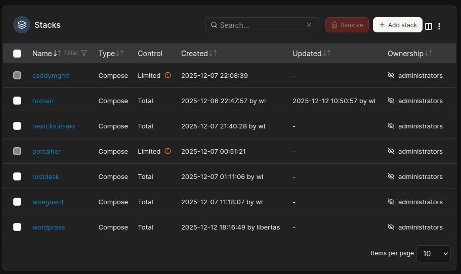 As you can see, all stacks are configured inside Portainer except for: