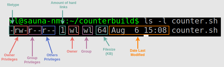 The file permissions are represented with 9 letters and are divided into 3 parts with 3 letters each. The order of permission in each part is always the same, from the left;