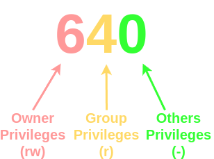 Absolute permissions is the older way to set file permission. The file permission is represented in three octal numbers (0-7), for example 640, which is user=read+write, group=read and others=none. To break it down: