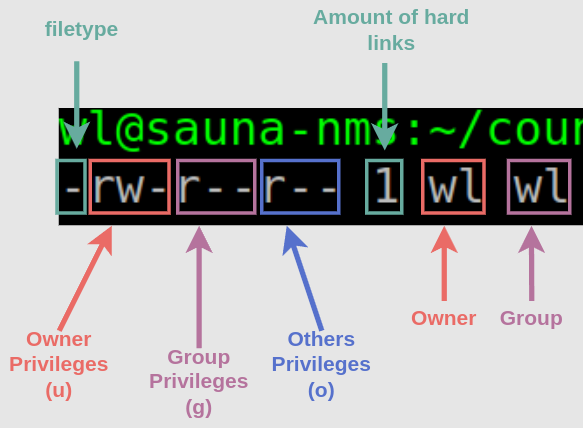 When you do an ls -l command, you can see the symbolic privileges. Those where actually explained part 1: