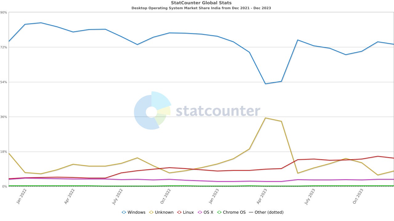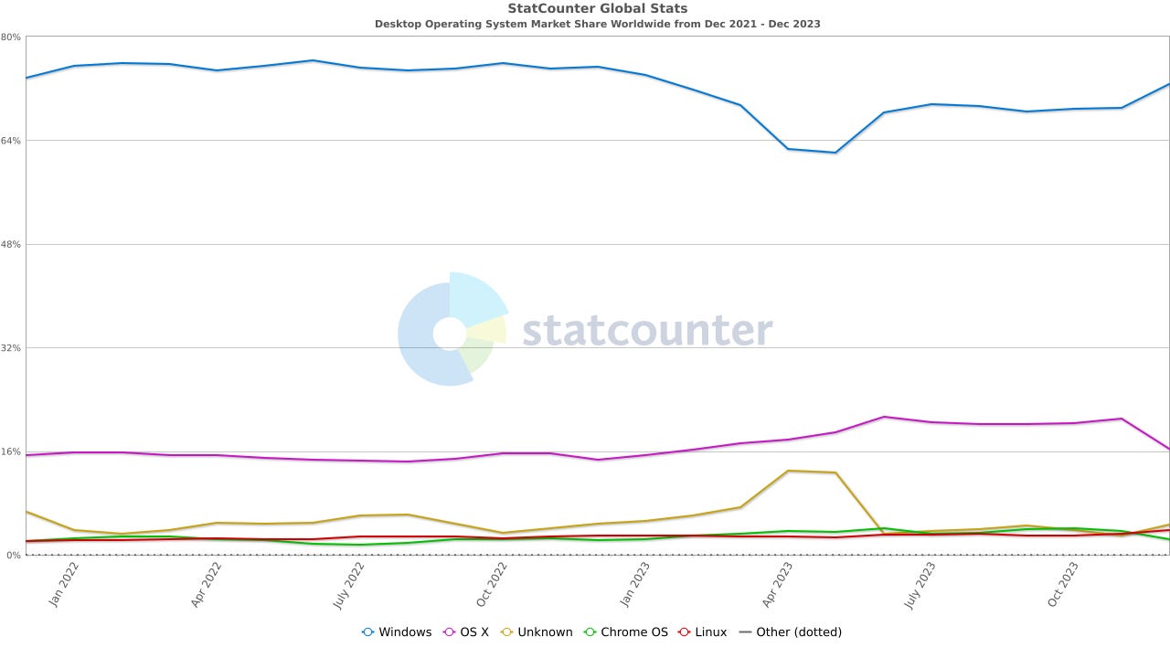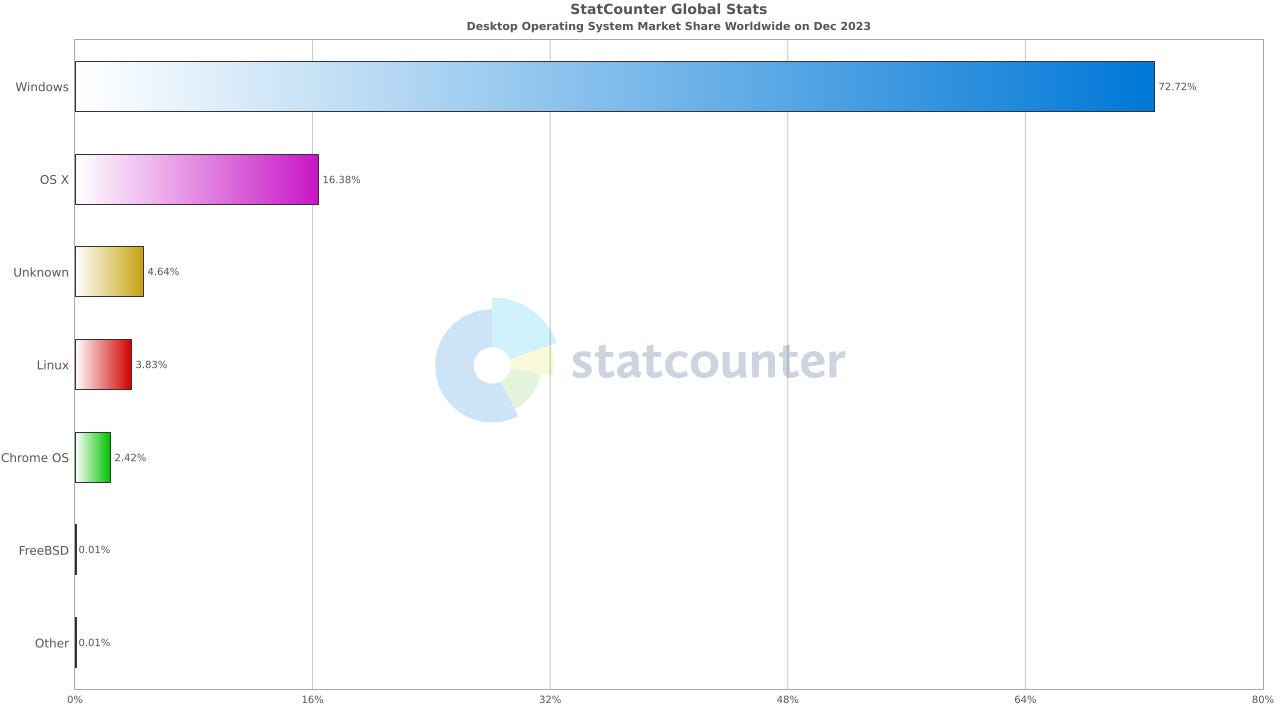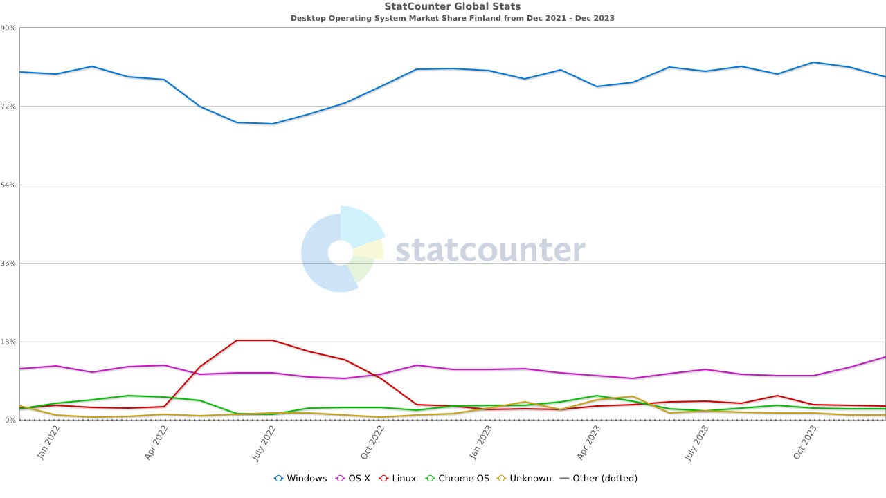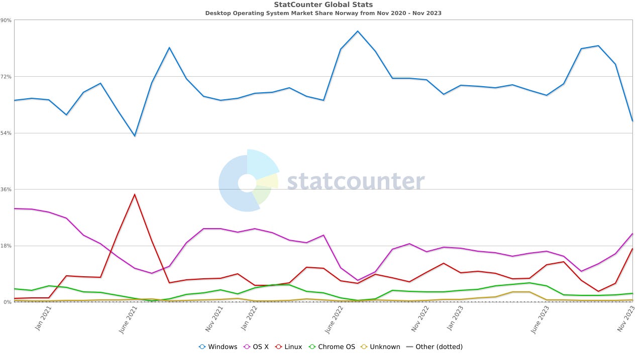 At least it appears like Norway is high above the global average, but where are the users? As an eye witness, Microsoft seems to dominate most big businesses and only Apple seems to be challenging. Maybe the small businesses and home computers are migrating to Linux?
