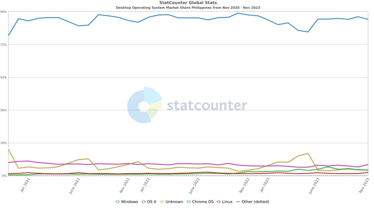 I have just been on a vacation in The Phillippines and was curious about the Linux statistics there. My theory was that it would be more popular due to it’s low cost and backwards compatibility, considering Philippines is a developing country. My theory was however completely wrong; it is below the global average:
