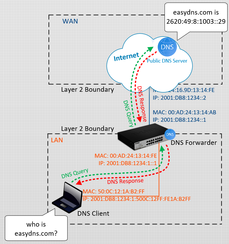 A DNS client is asking it’s configured server on how to get to “easydns.com” with a DNS Query.