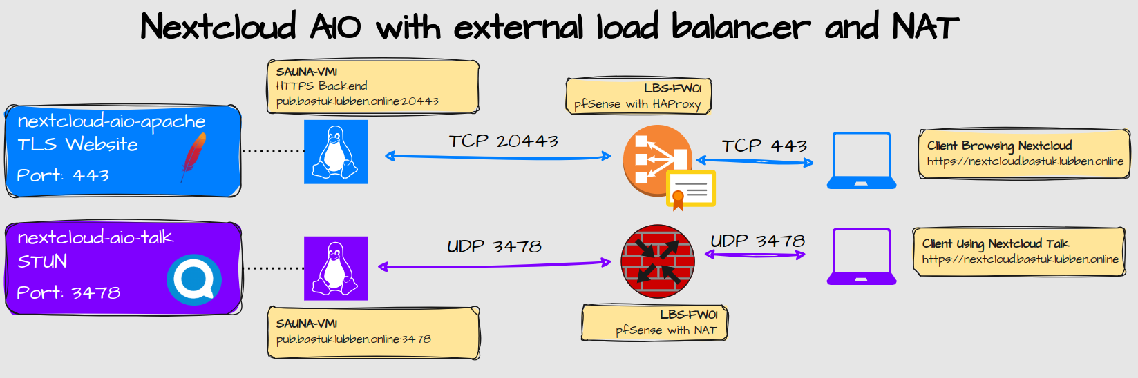 The HTTPS traffic destined to nextcloud.bastuklubben.online is forwarded to pub.bastuklubben.online:20443