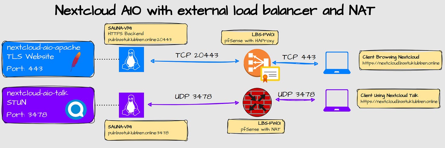 In the previous article from 2023 I had a separate frontend/backend for Nextcloud Talk. Back then I used an external High-Performance Backend server where STUN traffic was listening on TCP 5349. That server has been decommissioned because the Nextcloud Talk container is a lot easier to setup and more stable.
