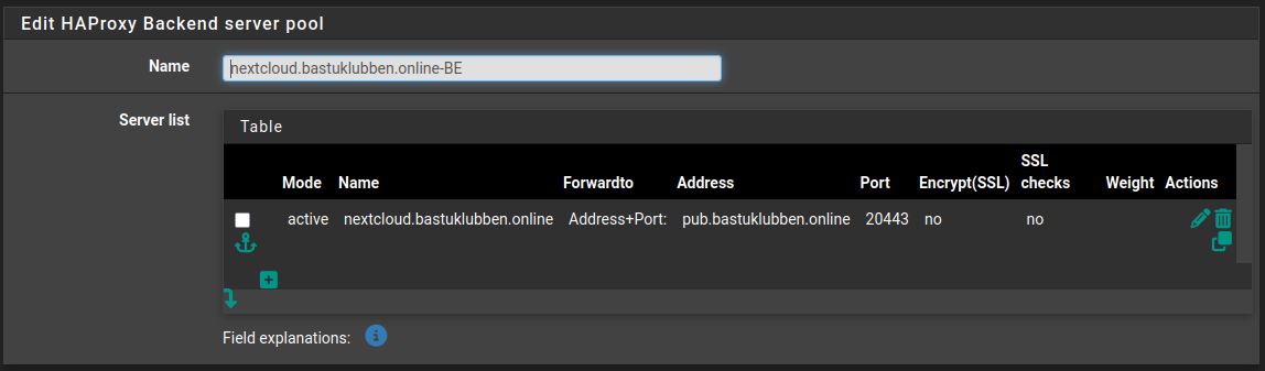 The setup for Nextcloud HTTPS proxy is almost identical to the one described in that article. What differs is that you don’t need any HTTP backend, unless you want to enable HTTP redirect to HTTPS. There is no need for ACME-Challenge because the Nextcloud AIO mastercontainer knows that it is behind a proxy and will therefore communicate with the RP unencrypted and rely on pfSense to encrypt traffic to the end-user.