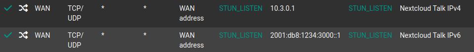 STUN traffic on UDP 3478 is port forwarded (NAT) through the firewall. Both IPv4 and IPv6 traffic is being forwarded.