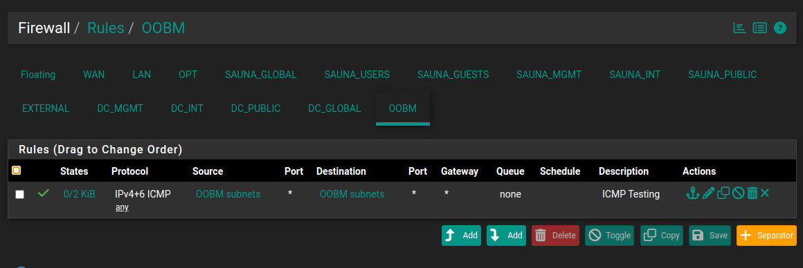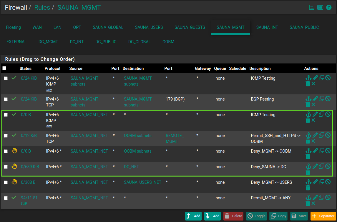 For example, under Firewall > Rules > SAUNA_MGMT, I have created four additional rules: