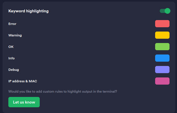 I used Termius for an hour and I really like it already. However, I’m using the trial version and I’m not sure if I’m willing to pay for this yet. If customizable keyword highlighting becomes supported, I might change my mind.