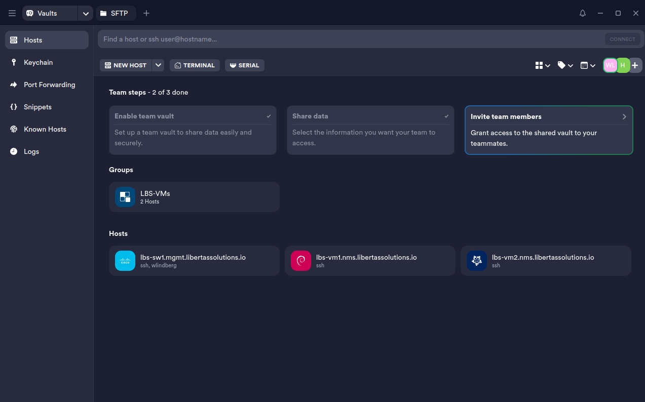 One feature I noticed and tried out was the SFTP client. This will come in handy for sure! Instead of manually have to open a terminal window in one of my directories, writing “scp example.txt lbs-vm1….” I can just drag and drop files to and from my hosts with their built-in SFTP client!