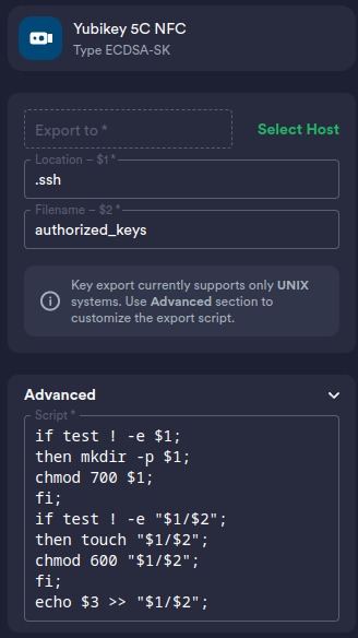 When you click export and attach, you have to type your password once, and Termius executes the script from the Advanced section so you don't have to add the public keys on the host yourself.