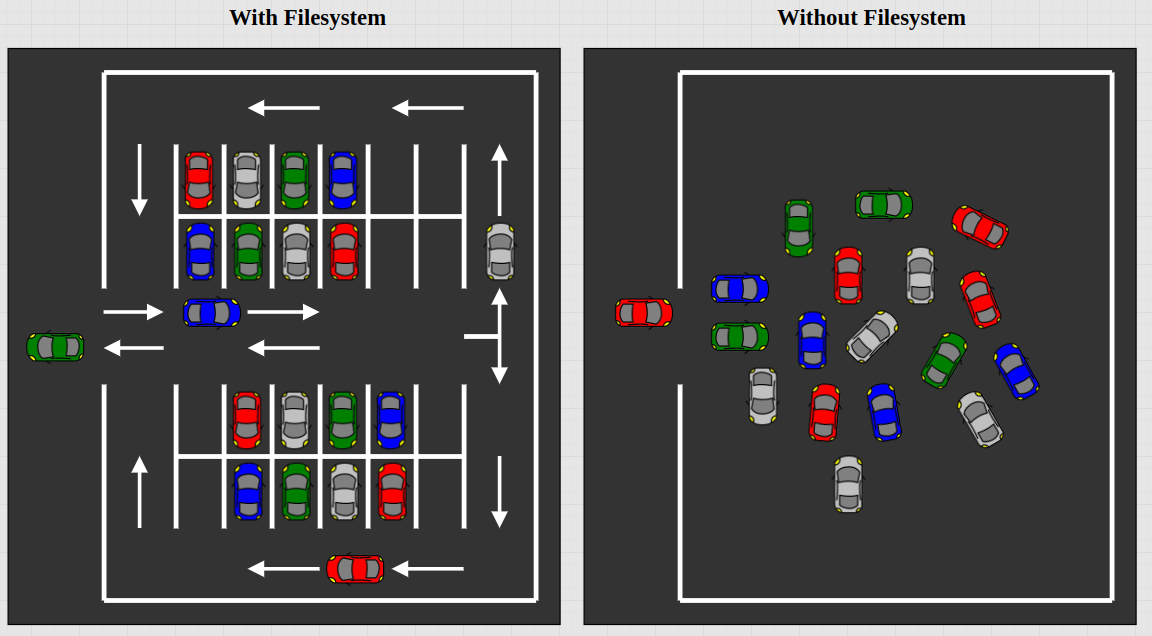 A file system defines how to separate files and folders from each other. Think of it like a parking lot with lanes, compared to a parking lot without lanes. The latter can become quite unorganized; it can be hard to find your car, or even retrieve it, if there is no system.