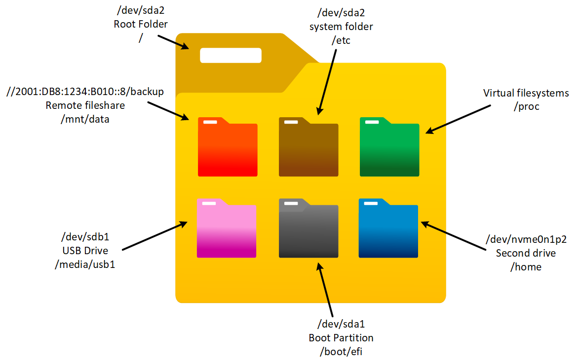 From a layman’s perspective, it might look like everything is stored under one drive. It may be so, but not necessarily. It depends where the different directories are mounted. It could for example be like this: