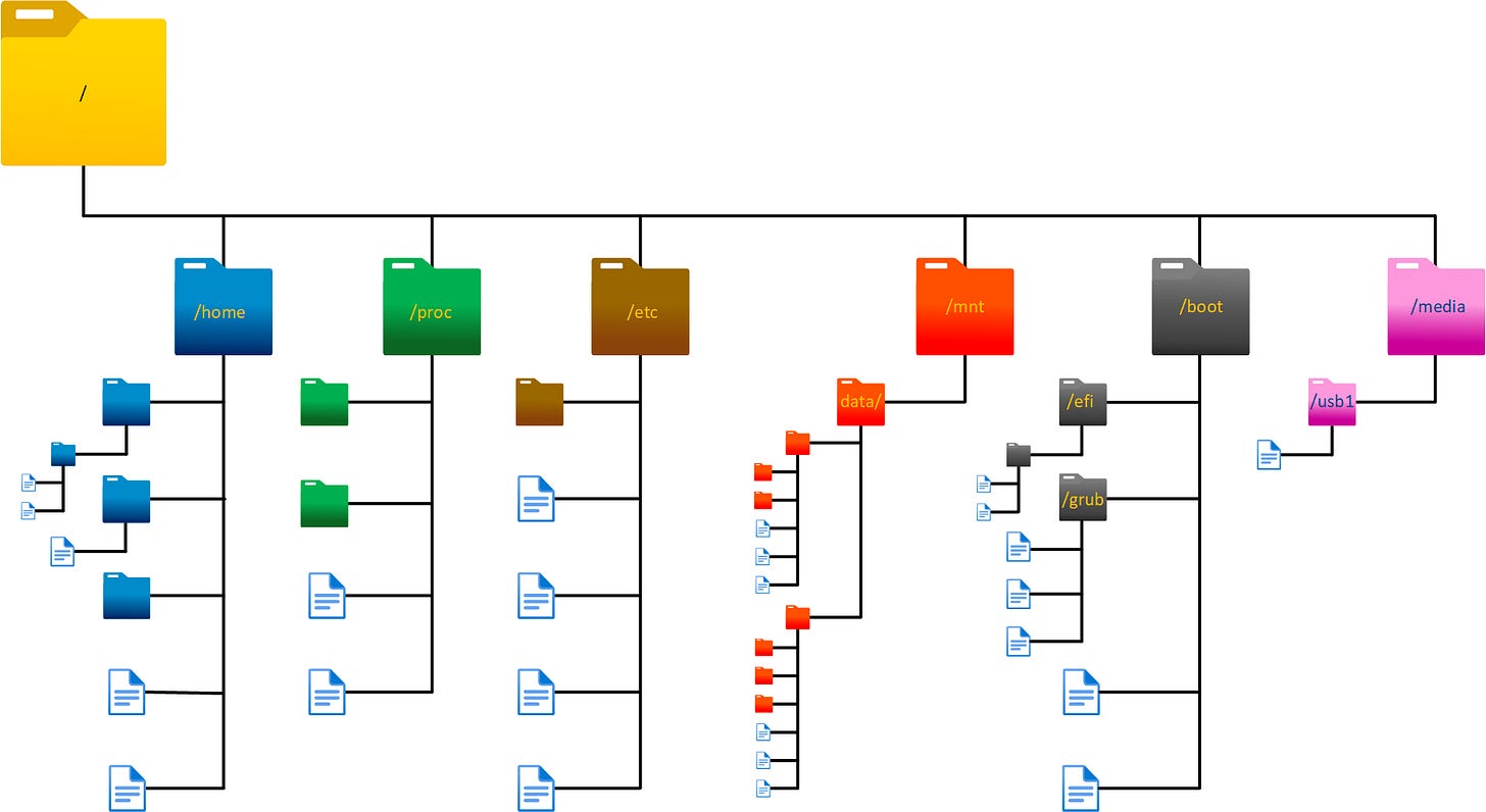In Linux it’s very different. The Linux filesystem is just one big monolithic filesystem where everything is stored under the root directory, which is defined with a forward slash, “/”.