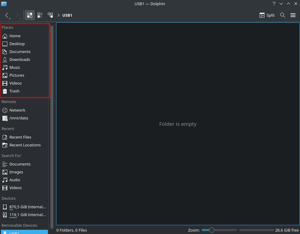 This is where the additional drives and USB memory sticks mounts by default. In the file explorer, you can find them under “Other Locations” or “Removable Devices”.