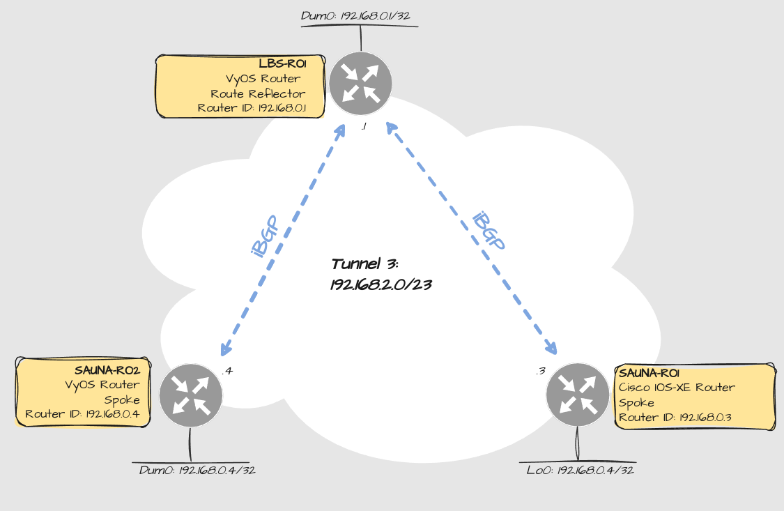 The last thing before wrapping up part 1 is to configure BGP neighbor relationship between the tunnel IP addresses, as shown in the drawing in the beginning.