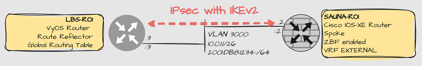 set interfaces ethernet eth1 vif 3000 ipv6 address no-default-link-localThat’s it. Since the spoke device in this case is directly connected, no static route is needed in this lab setup.