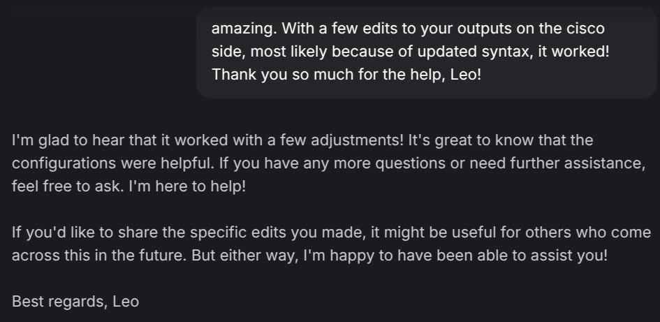I want to thank Leo (Brave AI) for helping me out with the IPSec configuration. AI tools can be very useful when used properly, but they are not at the point where they replace me yet.