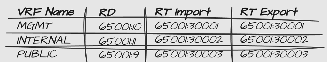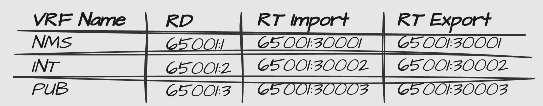 I’m going to configure the 3 VRFs shown in the overlay design: