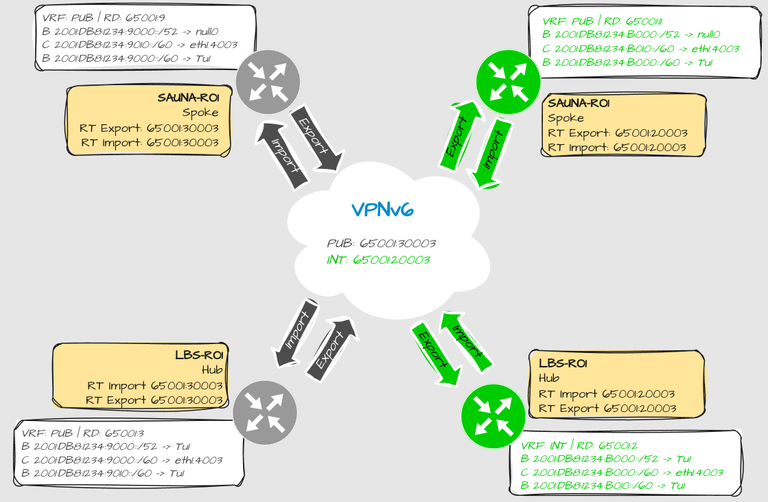 Note: The reason why the names and RDs are different between hub and spoke are of historical reasons. The important thing is that the route targets matches.